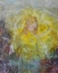 Vanuit een donkere ondergrond de lente uitgebeeld met witte gesso en acryl.
