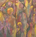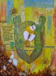 2010Van knop tot vrucht. Opengaan en bloeien om vrucht te dragen. Acrylschildering met collage van stof. Compleet in blankhouten baklijst en gevernist.