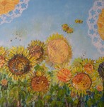 2001Op paneel met acrylverf geschilderde zonnebloemen. Gevernist en voorzien van brede, witte lijst.