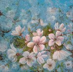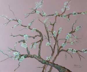 2011Op een ondergrond van tissues is met gesso en acrylverf naar voorbeeld in de natuur geschilderd. De uitbundigheid van het openspringen heb ik geprobeerd te treffen. Het werk is ingelijst in een brede zilverkleurige lijst. Prijs is compleet met inlijsting.