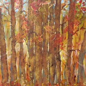 2020Sfeer van een bos in de herfst. Compleet met houten baklijst. Werk is gevernist.
