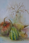 2003De herfstkleuren in kalebassen en pompoenen geven de echte herfstkleuren vorm. Ingelijst met passepartout en blankhouten wissellijst.
