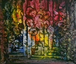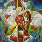 2019Vanuit gekozen kleuren en met schraper het werk opgezet, daarna verder uitgewerkt. De kruisweg van Jezus. Links de donkere wereld, rechts voorbij het graf, de nieuwe wereld. Acrylverf, gevernist, met witte/zwarte of blanhouten baklijst.